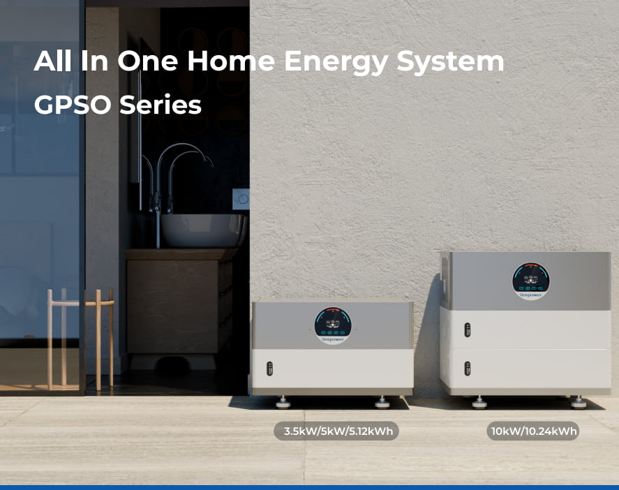 Gospower 3.5kW All In One Home Energy System. The Gospower GPSO series all-in one energy storage system combines an inverter, MPPT solar charger, and battery. It supports a maximum of 12 units for paralleling. The battery capacity ranges from 5.12kWh to 20.48kWh with up to 4 units paralleling.