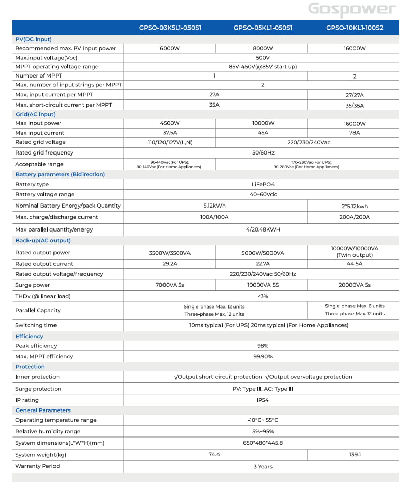 The Gospower GPSO series all-in one energy storage system combines an inverter, MPPT solar charger, and battery. It supports a maximum of 12 units in parallel. The battery capacity ranges from 5.12kWh to 20.48kWh with up to 4 units paralleling.